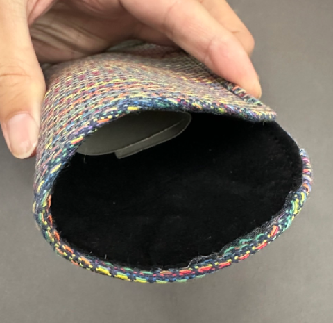 絣調の七色レインボーの生地を使った眼鏡ケースです。口が大きく開くので中身が見やすく取り出しやすいです。