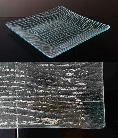 薄い緑色のガラスに銀色がキラリと輝く、スタイリッシュなガラスのプレートです。