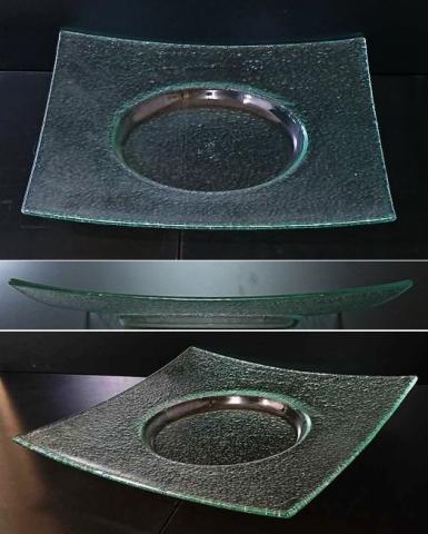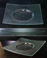 涼しげな緑がかったガラスのプレートです。ボコボコっとした表面のテクスチャーと光の加減で、見せる表情が変化します。この製品の特性をお楽しみいただきながら、料理の盛り付けにお使いいただけましたら幸いです。