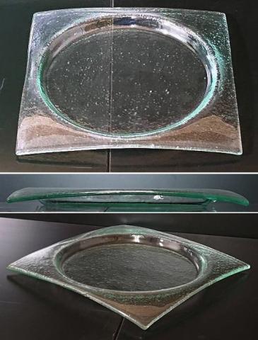 涼しげな緑がかったガラスのプレートです。ボコボコっとした表面のテクスチャーと光の加減で、見せる表情が変化します。この製品の特性をお楽しみいただきながら、料理の盛り付けにお使いいただけましたら幸いです。
