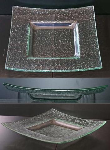 涼しげな緑がかったガラスのプレートです。ボコボコっとした表面のテクスチャーと光の加減で、見せる表情が変化します。この製品の特性をお楽しみいただきながら、料理の盛り付けにお使いいただけましたら幸いです。
