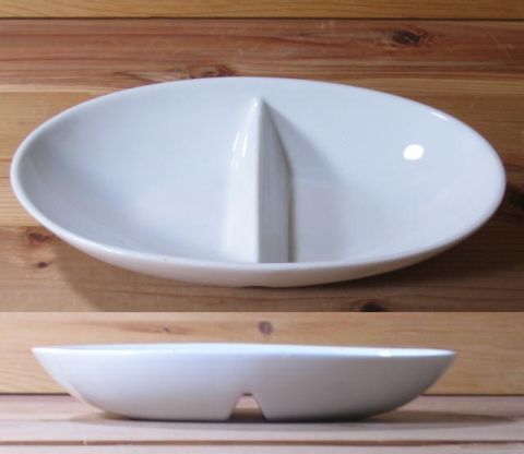 二つの味を一度に楽しめる、中央に仕切りのある楕円深皿。