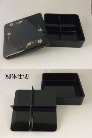 【送料無料】【訳あり】木製7寸角小隅丸弁当 仕切付 黒漆菊唐草 5個