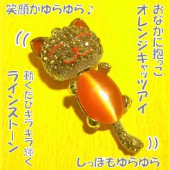 可愛い表情の福猫ストラップです。胴体部分のオレンジキャッツアイが魅力的に輝き、シッポがゆらゆら揺れて愛嬌を振りまきます。